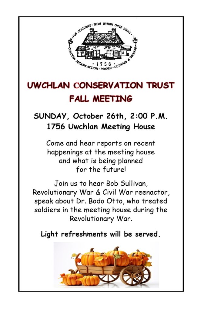 News & Events The Uwchlan Conservation Trust Fall Meeting is Sunday, October 26, 2025 at 2:00pm. Members and guests are invited to attend.